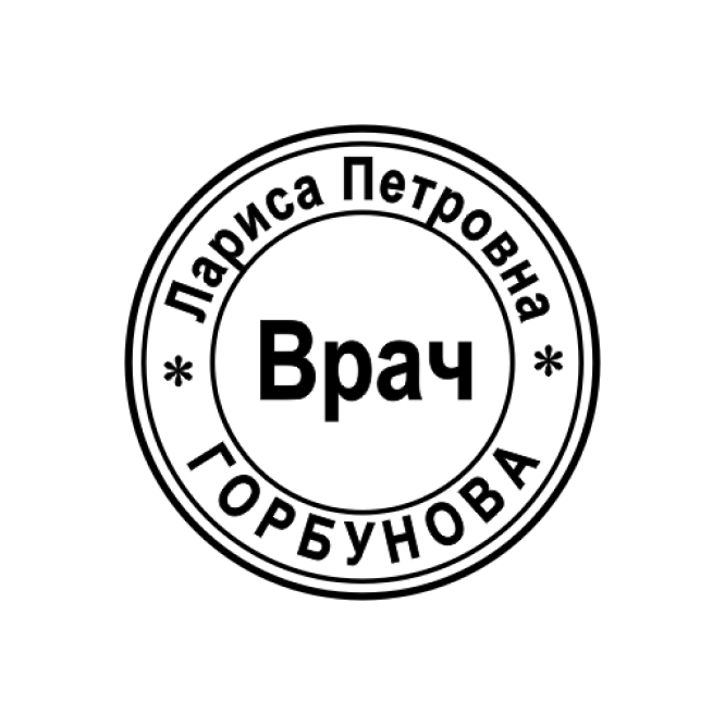 Как и все печати, врачебная, круглой формы и имеет диаметр 30 мм, все зависит от того, сколько информации на ней будет отражено. На медицинском штемпеле может быть указана следующая информация: